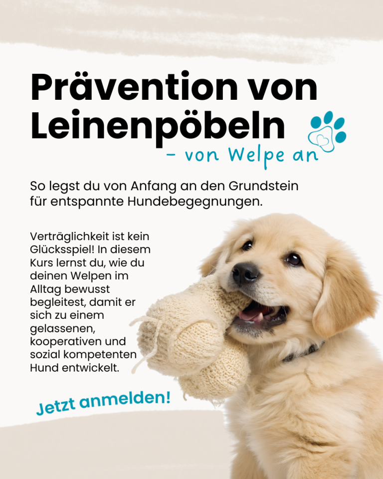 In diesem Onlinekurs erhältst du fundiertes Hintergrundwissen, alltagsnahe Handlungsempfehlungen und einfache Übungen, um in der Welpenzeit ein stabiles Fundament für entspannte Begegnungen zu legen.